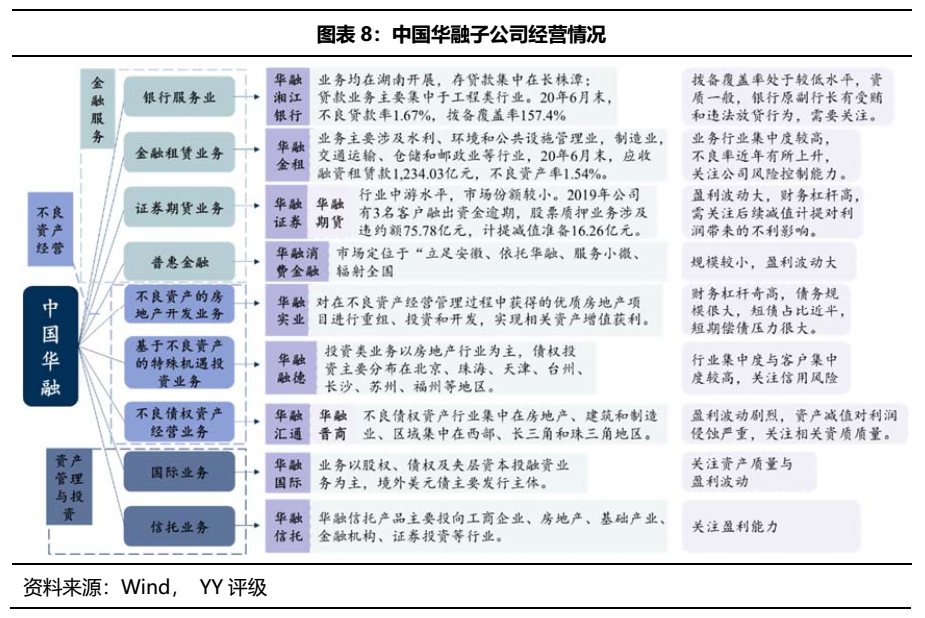 中國華融聚焦不良資產(chǎn)的收購、管理與處置,業(yè)務(wù)主要分為不良資產(chǎn)經(jīng)營、金融服務(wù)和資產(chǎn)管理與投資三大板塊。其中不良資產(chǎn)經(jīng)營業(yè)務(wù)包括不良債權(quán)資產(chǎn)經(jīng)營、政策性債轉(zhuǎn)股業(yè)務(wù)、市場化債轉(zhuǎn)股業(yè)務(wù)以及子公司開展的不良債權(quán)資產(chǎn)經(jīng)營業(yè)務(wù)、基于不良資產(chǎn)的特殊機遇投資業(yè)務(wù)、基于不良資產(chǎn)的房地產(chǎn)開發(fā)業(yè)務(wù);公司金融服務(wù)和資產(chǎn)管理與投資業(yè)務(wù)則主要由子公司負(fù)責(zé)經(jīng)營。