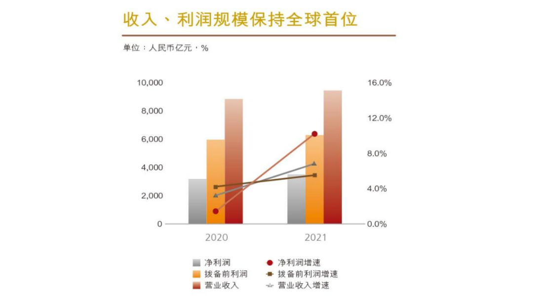 根據(jù)工行2021年報(bào),不管資產(chǎn)、資本、存款、貸款,該行繼續(xù)保持全球第一,凈利潤(rùn)繼續(xù)保持全球銀行業(yè)第一地位。從國(guó)際排名來看,工行已經(jīng)連續(xù)9年位列英國(guó)《銀行家》全球銀行1000強(qiáng)和美國(guó)《福布斯》全球企業(yè)2000強(qiáng)榜首、位列美國(guó)《財(cái)富》500強(qiáng)榜單全球商業(yè)銀行首位,連續(xù)6年蟬聯(lián)全球最具價(jià)值銀行品牌榜首。
