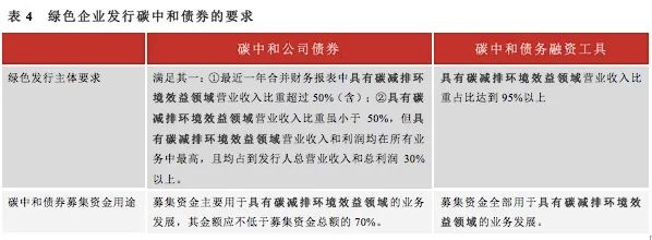 在我們此前的報(bào)告《綠色債券的2020,綠色企業(yè)主體如何認(rèn)證?》中介紹了綠色產(chǎn)業(yè)領(lǐng)域企業(yè)發(fā)行綠色債券的情況。已發(fā)行的碳中和公司債中,華能天成融資租賃有限公司發(fā)行的“GC天成01”就是經(jīng)認(rèn)證為綠色企業(yè)的主體發(fā)行的。結(jié)合綠色企業(yè)主體的認(rèn)定標(biāo)準(zhǔn),我們認(rèn)為,綠色企業(yè)主體如果要發(fā)行碳中和債券,需要滿足的要求見下表。