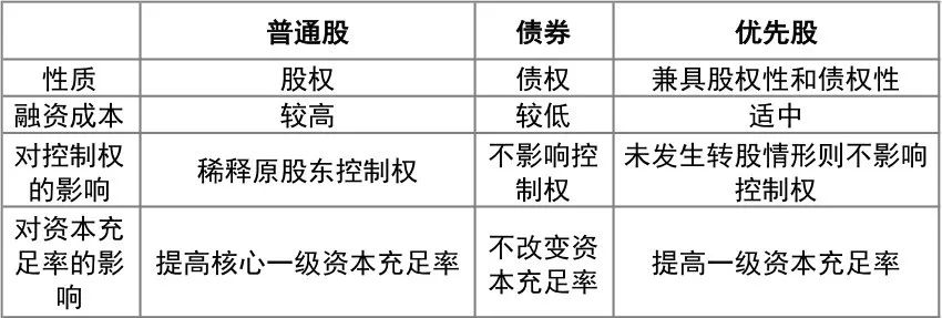 從融資成本角度,普通股發(fā)行一般需要較為繁瑣的審核程序,發(fā)行成本較高;債券的發(fā)行較為簡易,成本較低;優(yōu)先股介于二者之間。從控制權(quán)角度,優(yōu)先股不會(huì)稀釋原股東股權(quán)比例。從資本指標(biāo)角度,債券不能提高銀行的資本充足率,而普通股和優(yōu)先股均有此功能。若銀行以提高資本充足率為目標(biāo)發(fā)行融資工具且保持原股東控制權(quán)不發(fā)生重大改變,優(yōu)先股是相對合適的融資工具,既能滿足監(jiān)管要求,還能解決再融資問題。