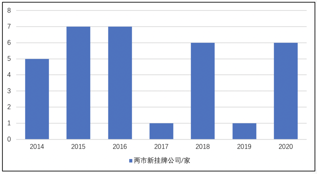 圖2  2014-2020年上交所、深交所優(yōu)先股市場新增上市公司數(shù)量