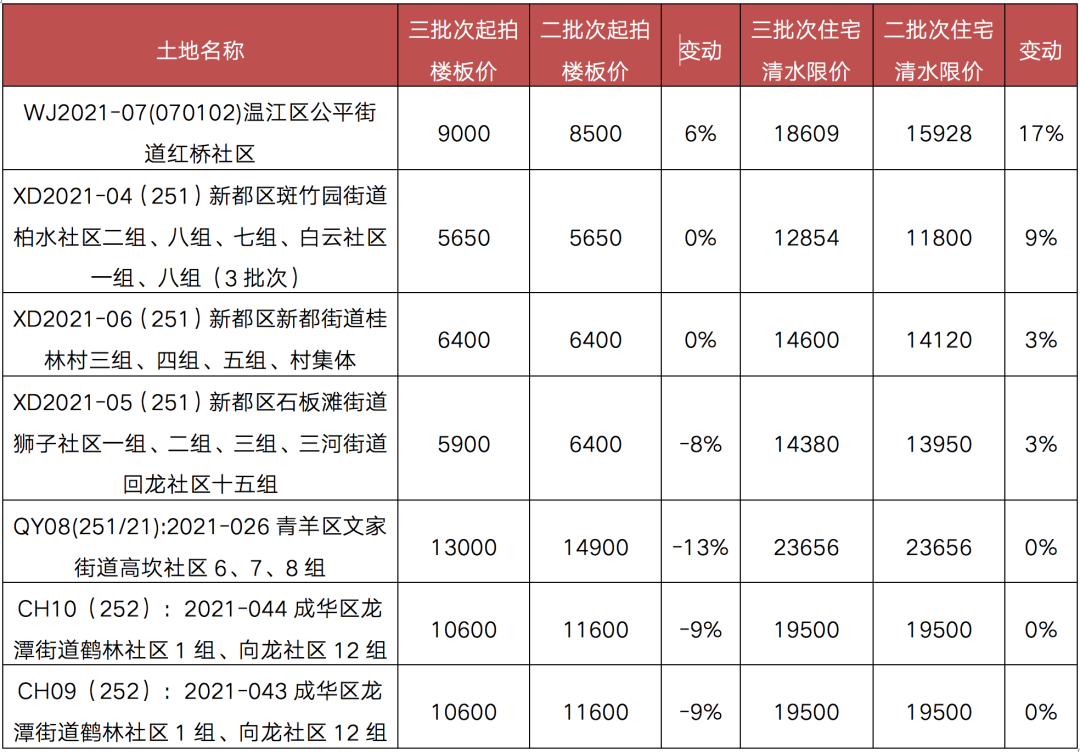 表:成都三輪土拍中回爐地塊的起拍價(jià)及商品住宅限價(jià)變動(dòng)(元/平方米)