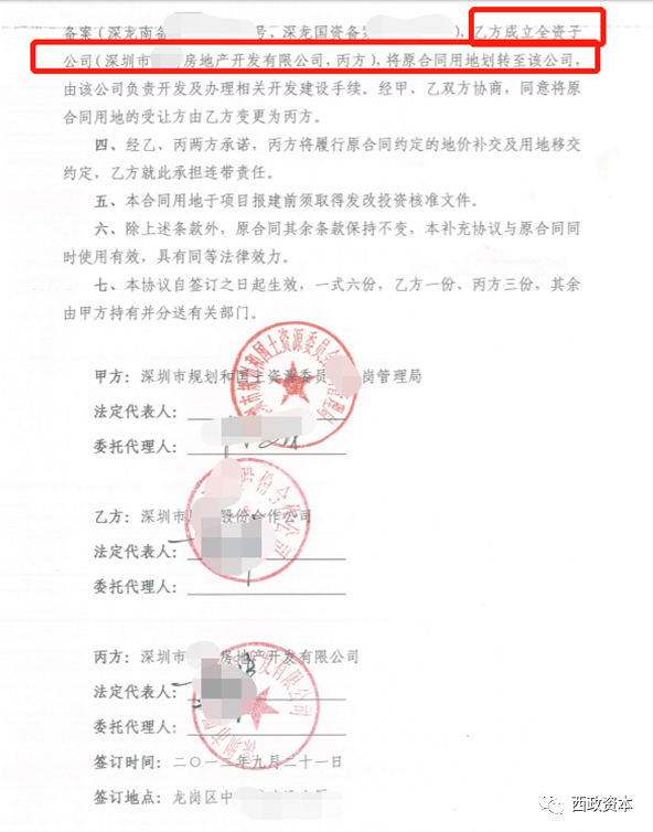 第一,補充協議簽訂主體為:國土部門VS股份合作公司 VS 股份合作公司新設立的全資子公司 ;