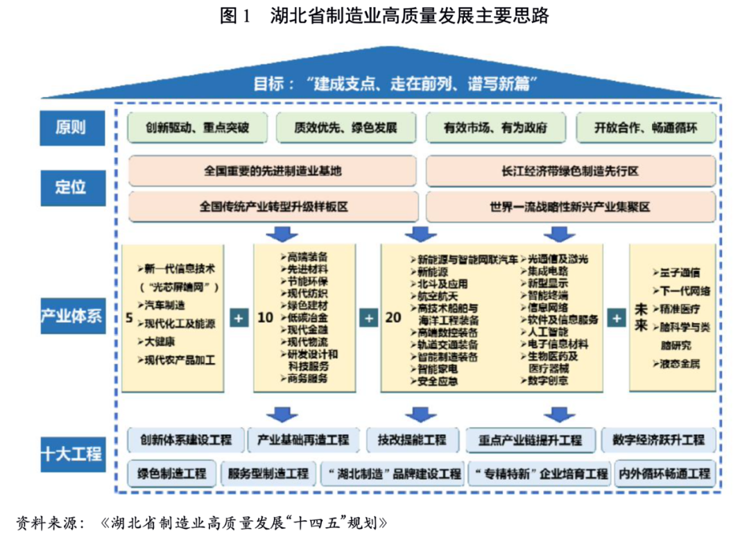 重點產業方面,湖北省經過長期發展形成了以汽車、鋼鐵、石化、電子信息、紡織和食品等產業為主導的工業體系格局。其中傳統產業占比超過83%,冶金、紡織等行業轉型步伐緩慢,新興產業對全省經濟的支撐作用有待提升。根據《湖北省制造業高質量發展“十四五”規劃》,湖北省著力打造5個萬億級支柱產業、鞏固提升10個5千億級優勢產業、培育壯大20個千億級特色產業集群,加快構建“51020”現代產業集群。