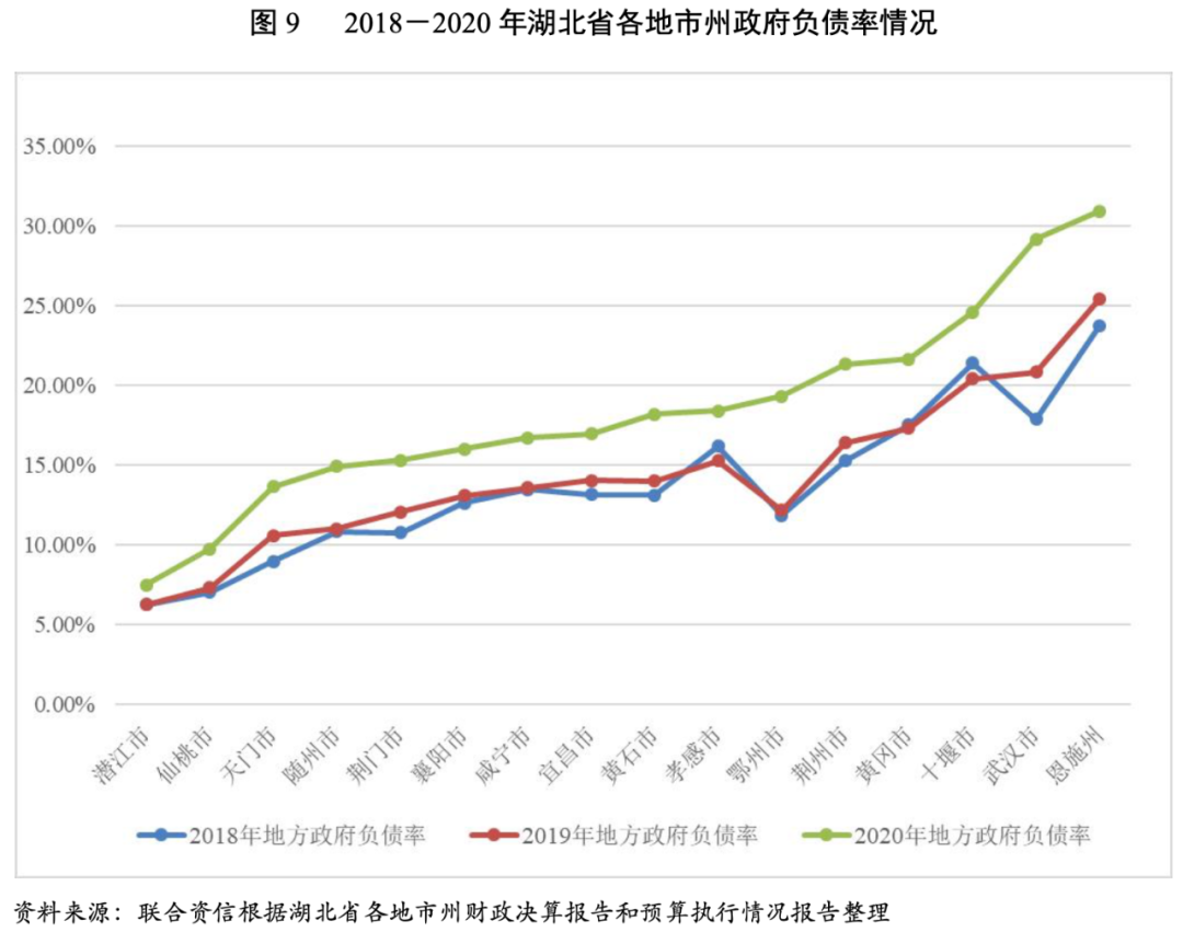 債務負擔方面,2018-2020年,湖北省各地市州政府負債率基本呈上升態勢。2020年,恩施州政府負債率在省內各地市州中最高,為30.92%,較上年末增長5.49個百分點,武漢市政府負債率增幅最大,為8.35個百分點。