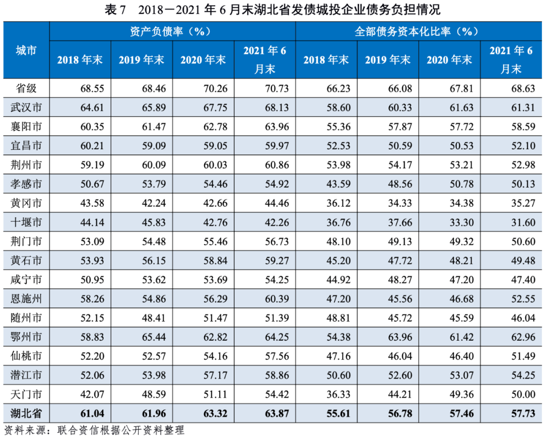 從發債城投企業債務負擔來看,2018-2020年末,湖北省各地市州發債城投企業資產負債率和全部債務資本化比率均呈上升態勢。從各地市州來看,截至2021年6月末,省本級、武漢市、襄陽市、荊州市、恩施州和鄂州市資產負債率均超過60.00%、全部債務資本化比率均超過50.00%,宜昌市和黃石市接近上述水平,債務負擔相對較重。