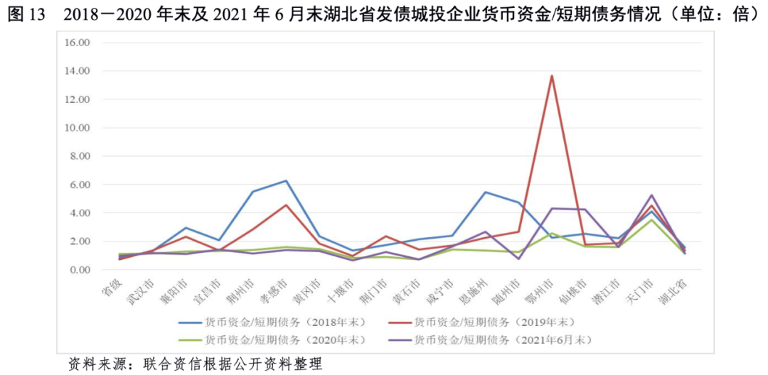 從湖北省發債城投企業貨幣資金對短期債務的覆蓋情況看,2018-2020年末,除鄂州市外,湖北省各地市州發債城投企業貨幣資金對短期債務的覆蓋程度整體呈下降趨勢。截至2021年6月末,省本級、十堰市、黃石市和隨州市貨幣資金對短期債務的覆蓋程度低于1.00倍,其他地市州均在1.00倍以上。