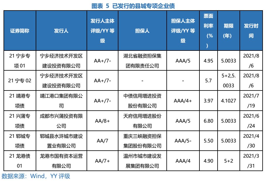 目前已發行項目數量較少,多數項目由擔保公司進行擔保,使得債項評級達到AAA。截止至2021年8月15日,已有5家城投平臺發行6只縣城專項企業債,其中寧鄉經濟技術開發區建設投資有限公司發行的是雙品種企業債,整體發行單數偏少。除了“21寧專02”無擔保外,其余5只債券均加了擔保使得債項評級達到AAA。此次發行指引的其中一個實質性利好就是“支持縣城特別是縣城新型城鎮化建設示范地區內主體信用評級優良的企業,以自身信用發行本專項企業債券”。在此之前,對于非省會城市的AA縣平臺,發改委一般要求有擔保措施,這一條對發行條件有所放松。多數債券還是選擇加擔保進行發行,可能因為這些平臺資質稍弱,若不加擔保,投資者認可度較差,發行難度有所增加。再進一步細看,5只債券中有4只選擇了不同的4家融資擔保公司進行擔保,另外1只債券“21龍港債01”由溫州市級主要平臺溫州市城市建設發展集團有限公司進行擔保。相比于由市場化的擔保公司對債券進行擔保,由其他層級更高的平臺進行擔保,減少擔保費用的支出,同時體現了區域內的城投資源協調。2021年8月5日寧鄉經濟技術開發區建設投資有限公司發行的“21寧專02”(品種一)為首只未加擔保的縣城專項企業債,最終發行利率為5.70%,較由湖北省融資擔保集團擔保的“21寧專02”(品種二)的發行利率4.95%,高出75BP。