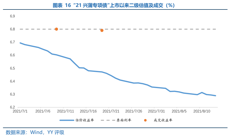 上市后二級估值一路下行,下行幅度高于可比中債中短期票據收益率。“21興蒲專項債”票面利率為6.80%,上市首日2021年7月1日二級估值已低于其票面利率11BP至6.69%。由于銀行間流動性充足和機構配置力量加強,二級估值一路下行41BP至2021年8月13日的6.29%。較同期AAA級5年期中債中短期票據到期收益率下行36BP,“21興蒲專項債”二級估值下行幅度更大。若機構在一級進行申購,在此期間內賬面可獲得一定的浮盈。