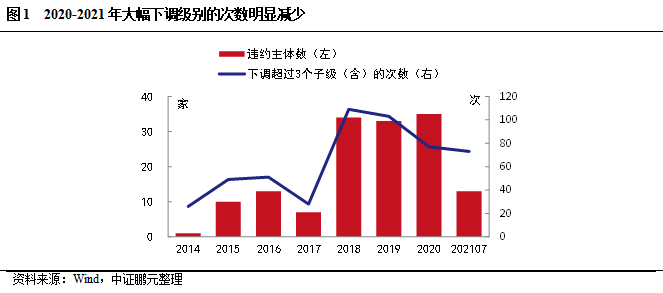 關(guān)于我國評(píng)級(jí)級(jí)別大幅調(diào)整的問題,近兩年有了較大改善。我國評(píng)級(jí)一次性調(diào)整級(jí)別超過三個(gè)子級(jí)(含)的次數(shù)在2018-2019年達(dá)到高峰后(分別為109次和103次),于2020-2021年期間呈下降趨勢(shì)(分別為77次和73次)(圖1)。特別是2020年,在違約主體數(shù)達(dá)到歷史最高點(diǎn)(35家)時(shí),仍能保持大幅降級(jí)次數(shù)減少的態(tài)勢(shì),一定程度上可以反映評(píng)級(jí)機(jī)構(gòu)通過努力,加強(qiáng)預(yù)警,避免大幅度的級(jí)別調(diào)整。