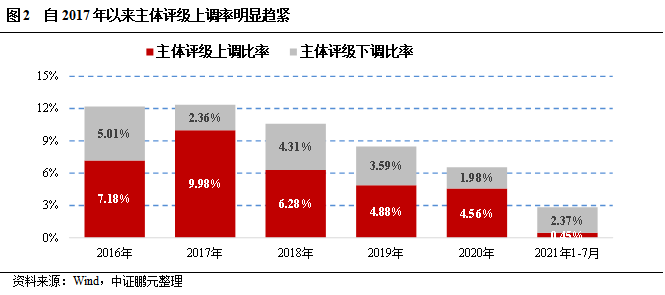 同時(shí),我國評(píng)級(jí)機(jī)構(gòu)在上調(diào)級(jí)別方面已趨于謹(jǐn)慎。2016-2021年級(jí)別調(diào)整率表明,自2017年以來我國發(fā)債主體的評(píng)級(jí)上調(diào)率已明顯下降,2021年截至目前更是低至0.45%(圖2)。2018-2021年的上調(diào)/下調(diào)比率也從2018年的1.46下降至2021年的0.19,整體呈下降趨勢(shì)。