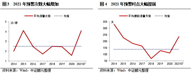 此外,我們觀察到,2018-2020年均有違約當(dāng)日才進(jìn)行首次級(jí)別下調(diào)的情況,造成級(jí)別斷崖式下降。其中,2018年有5家,2019年和2020年各1家,在2021年截至目前尚未發(fā)生。這也反映出,評(píng)級(jí)機(jī)構(gòu)也在不斷地調(diào)整評(píng)級(jí)機(jī)制,避免這種毫無預(yù)警的斷崖式下調(diào)。二、預(yù)警次數(shù)顯著增加,預(yù)警時(shí)間大幅提前