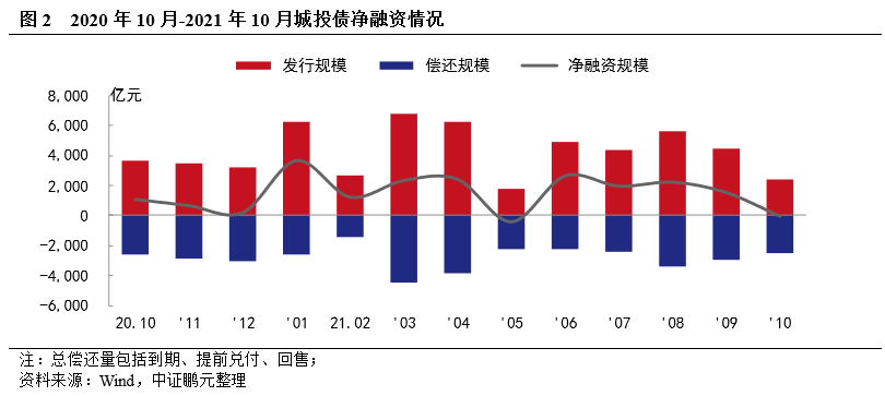 10月份城投債發行規模環比大幅下降。10月份,各品種城投債共發行327只,發行規模2,435.81億元,發行數量和規模同比分別下降28%和33%,環比分別下降50%和45%;其中,交易所、銀行間市場、企業債城投債券發行規模環比分別下降65%、25%、81%;10月份,城投債凈償還64.93億元,為今年第二次月度呈現凈償還。