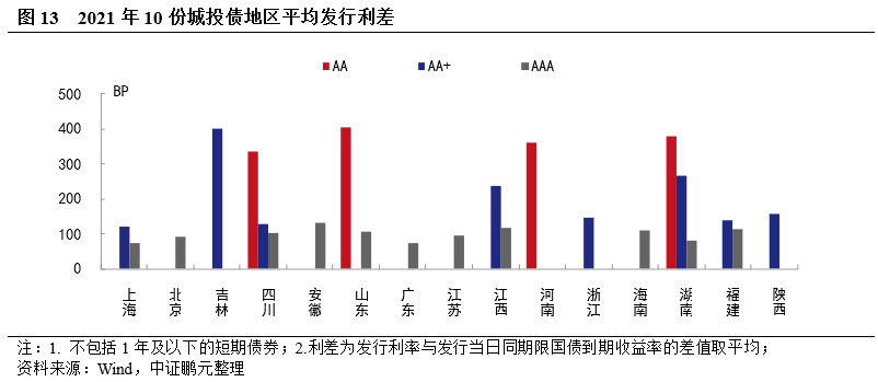 10月吉林AA+級、山東AA級平臺發行利差在400BP以上。10月份,吉林AA+級城投平臺平均發行利差401BP;山東AA級平均發行利差406BP;四川、河南以及湖南的AA級平臺平均發行利差也在300BP以上。