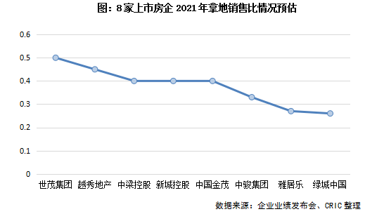從部分公布了2021年投資預算的房企來看,不同房企的拿地銷售比有較大的差異:世茂、中梁等房企提出將按銷售的50%和40%比例來控制拿地,而金茂的預期的全口徑投資金額為千億左右,整體拿地銷售比達到0.4。