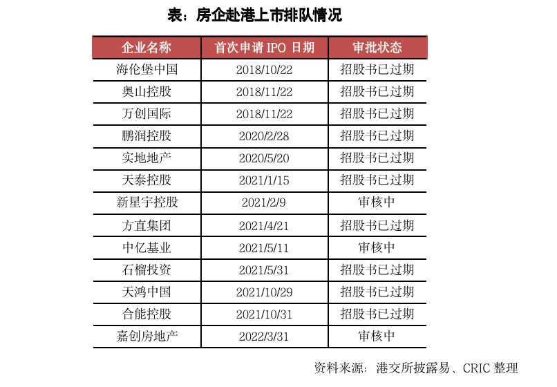 本月沒有新增房企遞交上市申請,因此截至2022年5月底,在港交所在遞交過招股書但仍未成功上市的房企為13家,其中有10家房企在招股書過期后都沒有更新招股書,未來是否會繼續上市進程還有待觀察。